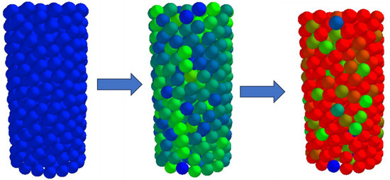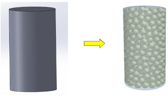 Given the diverse sizes and shapes of actual iron ore samples, a uniform model is essential for facilitating model construction. Consequently, a cylindrical model with a height of 40 mm and a diameter of 20 mm has been chosen to represent the ore, providing a standardized approach for the study. In constructing a three-dimensional simplified model, SolidWorks software (2018) was utilized to create the model, and the Discrete Element Method (DEM) software (2018), EDEM, was subsequently employed for three-dimensional particle filling. Specifically, the primary particle accumulation method was applied to fill the model with 3-mm-diameter spherical particles. This selection was made based on a thorough review of the literature [10] and practical calculations, ensuring the suitability of the chosen particles for the filling process. The schematic diagram of particle filling is shown in Figure 2. Figure 2 illustrates the process of particle filling of the granular model through the granular factory, with a particular focus on the model prior to filling and the model following the filling process. The diameter of the model is 20 mm, the height is 40 mm, and the number of spherical particles filled is 441.