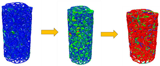 In order to guarantee the feasibility and accuracy of the bonding parameters in the ore bonding model, it is necessary to verify them through simulation using the discrete element software EDEM. This process should be conducted using the characterized bonding parameters as a benchmark. The simulation process is shown in Figure 7. The blue color indicates a relatively small compressive force, ranging from 35,000 N to 45,000 N. The green color represents a larger compressive force, spanning from 45,000 N to 55,000 N. The red color implies that the compressive force is approaching its maximum value, specifically within the range of 55,000 N to 65,000 N. This clear delineation effectively presents the variations in compressive forces, offering valuable insights for further analysis and understanding of the mechanical behavior under study. The results demonstrate that the compressive strength of the simulation model is 199.9 MPa, with a simulation error of less than 5%. This indicates that the established simulation model and characterized bonding parameters can realistically model the crushing of ore under uniaxial compression testing.