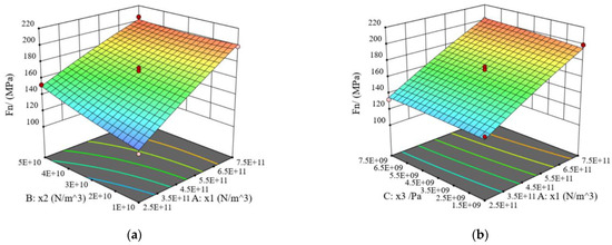 A review of the data in Table 6 indicates that the p-value observed during the secondary full simulation is below the significance level of 0.01, which provides compelling evidence that the experimental variables exert a significant influence on the model. Furthermore, the p-value of the misfit term exceeded 0.05, indicating that the misfit term was not significant. This confirmed that the constructed quadratic regression equation was in good agreement with the actual and adequately and accurately described the correlation between the variables. The correlation between the compressive strength of the ore bonding model and the normal stiffness per unit area (x1), the shear stiffness per unit area (x2), the critical normal stress (x3), and the critical shear stress (x4) during uniaxial compression tests was also investigated.