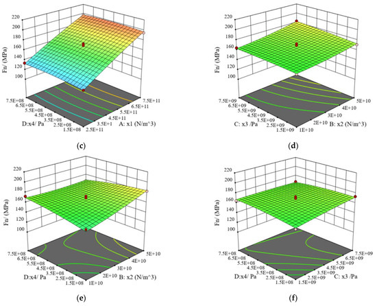 Influence of the interaction of various factors on the compressive strength of ore. (a) x3 = 4.5 × 109 Pa, x4 = 4.5 × 108 Pa, (b) x2 = 3 × 1010N/m3, x4 = 4.5 × 108 Pa, (c) x2 = 3 × 1010 N/m3, x3 = 4.5 × 109 Pa, (d) x1 = 4.5 × 1011 N/m3, x4 = 4.5 × 108 Pa, (e) x1 = 4.5 × 1011 N/m3, x3 = 4.5 × 109 Pa, (f) x1 = 4.5 × 1011 N/m3, x2 = 3 × 1010 N/m3.