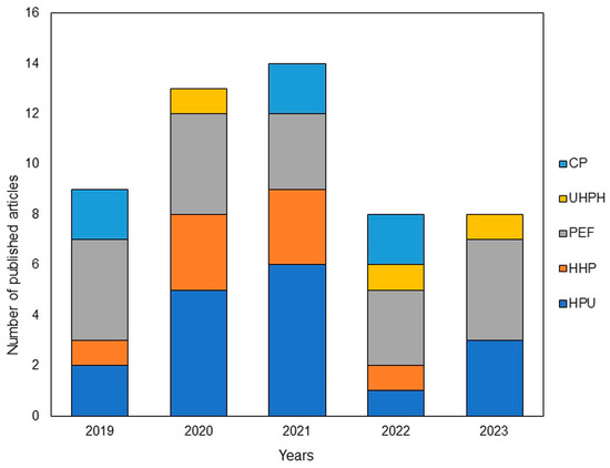 Number of published articles about non-thermal technologies applications in winemaking. CP: cold plasma; UHPH: Ultra-high pressure homogenization; PEF: Pulsed electric field; HHP: High hydrostatic pressure; HPU: High-power ultrasound.
