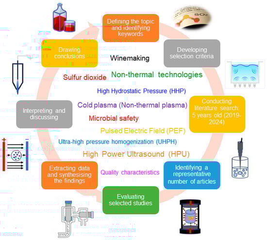Despite recent advances, an up-to-date overview of these non-thermal technologies with particular reference to their application in the winemaking process is lacking. Therefore, the present review aims to provide important information on five selected non-thermal technologies, namely HPU, HHP, PEF, UHPH, and CP, which will certainly be useful for all those involved in the wine sector. The applications, benefits, and challenges of selected technologies are listed in Table 1. To compose this review article, only scientific papers published between 2019 and 2024 (including those available at the time of writing this review in 2024) were retrieved from trusted and reputable online databases such as Google Scholar, Science Direct, Web of Science, and Scopus, using keywords such as non-thermal technologies, high-power ultrasound, high hydrostatic pressure, pulsed electric field, ultra-high pressure homogenization, cold plasma, winemaking, microbial safety, sulfur dioxide, and quality characteristics. Some other useful references have also been added to supplement this review. In total, a comprehensive and detailed analysis of the scientific repository resulted in 85 papers, including 55 research articles, 20 reviews, and 10 book chapters. Figure 1 shows the number of published articles per year and in relation to each technology about the analyzed topic during the last five years. As can be seen, 2020 and 2021 were the years with the highest number of published papers, while cumulatively the most studied technologies were pulsed electric field and high-power ultrasound, followed by high hydrostatic pressure. In addition, the strategy employed in composing this review article is presented in Figure 2. The next section provides some valuable insights into the latest applications of the aforementioned non-thermal technologies (HPU, HHP, PEF, UHPH, and CP) at different stages of winemaking and the changes in certain wine quality characteristics, particularly in phenolics, color, and aroma, based on the collected reports.