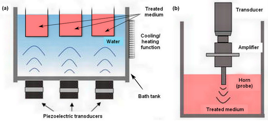 High-power ultrasound bath (a) and probe (b) systems. © 2020 Leire Astráin-Redín, Salomé Ciudad-Hidalgo, Javier Raso, Santiago Condón, Guillermo Cebrián, and Ignacio Álvarez. Adapted from Application of High-Power Ultrasound in the Food Industry; originally published under CC BY 3.0 license. Available from: 10.5772/intechopen.90444 https://www.intechopen.com/chapters/70675 (accessed on 14 March 2024) [73].
