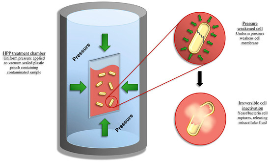 High hydrostatic pressure (HHP) mechanism of microbial inactivation in wine. This Figure was published in Preservatives and preservation approaches in beverages, Vol 15, Sanelle van Wyk and Filipa V.M. Silva, Nonthermal preservation of wine, 203–235, Copyright Elsevier (2019) [75].