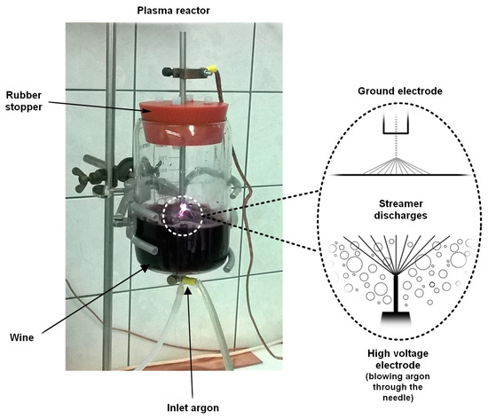 - Lukić, K.; Vukušić, T.; Tomašević, M.; Ćurko, N.; Gracin, L.; Kovačević Ganić, K. The Impact of High Voltage Electrical Discharge Plasma on the Chromatic Characteristics and Phenolic Composition of Red and White Wines. Innov. Food Sci. Emerg. Technol. 2019, 53, 70–77. [Google Scholar] [CrossRef]