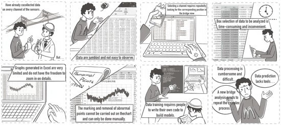 We conducted interviews with three experts in bridge monitoring data analysis at CCCC Highway Consultants Co., Ltd., which is headquartered in Beijing, China. By setting open questions to a certain extent, the interviewer can dig deeply into the real thoughts of the interviewees. Combined with the workflow observation and the interviews, we conclude the bridge engineering analysts’ pain points presented as a storyboard shown in Figure 1.