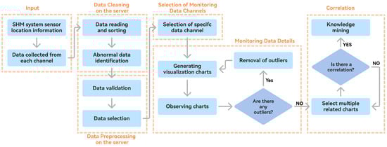 Based on the bridge engineering analysts’ pain points obtained by the above user study, we developed a bridge monitoring data visualization system. The technical framework of the system is shown in Figure 2. The system inputs include the sensor location information and the data collected from each channel. The data cleaning and preprocessing are performed on the server side, encompassing tasks such as reading, sorting, identifying abnormalities, validating data, and selecting relevant data. On the client side, users can select monitoring data channels and observe various types of visualization charts for knowledge mining. These visualization charts are used to discover abnormal points, present time-series data, show correlations between different channels, etc.