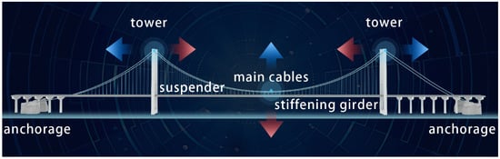 The structural components and deformation pattern of a suspension bridge. The red and blue arrows show the corresponding relationship between the movement of the tower tops and the girder mid-span.