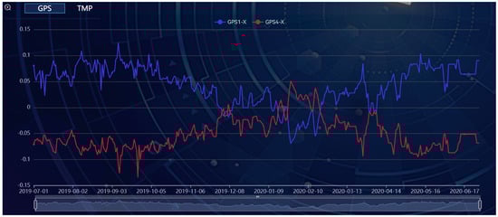 Further, the scatter plots in the top right panel, as shown in Figure 3, are used to explore the correlation between different variables in the time-series plot. Despite the great difference in variation ranges, the mid-span vertical displacements (GPS2-Z and GPS3-Z) exhibit a significant linear correlation with the tower-top horizontal displacements (GPS1-X and GPS4-X). The absolute value of the Pearson correlation coefficient for GPS2(3)-Z versus GPS1(4)-X is quite close to 1.0. Similar to scatter plots, the parallel coordinate plot in the bottom right corner can also be used to investigate the relationships between various variables.