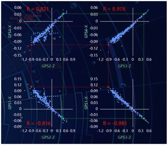 When a data point in any scatter plot is selected, the corresponding data points at the same time instant in the other plots are highlighted automatically. For example, in Figure 6, the green dots represent a deformation state of the bridge (designated as State A), while the red dots represent another state (State B). This feature allows for a clear interpretation of the bridge’s transition between different operational states.