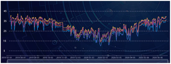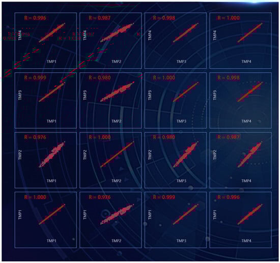 The bridge has 32 temperature sensors to measure the steel girder’s temperature distribution. Four top-plate temperature sensors at two cross-sections of the girder, namely TMP1, TMP2, TMP3, and TMP4, are selected. By clicking the plus sign in the upper left corner of the correlation panel, the scatter plot matrix is used to display all pairwise relationships between these four temperature variables, as shown in Figure 7. The correlation coefficients are all greater than 0.97, indicating a high level of uniformity in structural temperatures due to the steel’s excellent heat transfer performance. This uniformity is also evident in the time-series plot Figure 8.