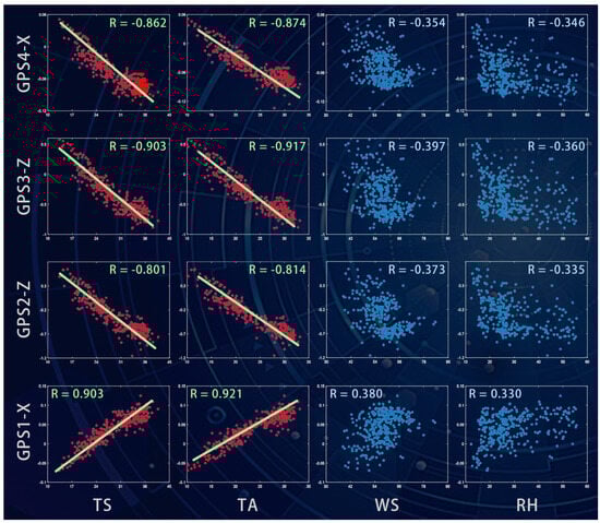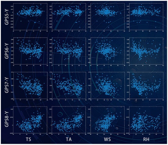 As a result, the average of all 32 temperature measurements is selected as the representative structural temperature, denoted as TS. Similarly, the representative variables of the ambient temperature, wind speeds, and relative humidity are determined as TA, WS, and RH, respectively. To explore the cause of the operational deformation, the vertical- and horizontal-axis variables in the scatter plot matrix correspond to the structural displacements (GPS 1-X, GPS 2-Z, GPS 3-Z, and GPS 4-X) and environmental actions (TS, TA, WS, and RH), respectively, as shown in Figure 9. When the “fitted lines” option is enabled, the best-fitted lines overlay the scatter plot where the absolute values of correlation coefficients are greater than 0.8. These lines serve as a guide to the tendency of variations in structural displacements with environmental actions. Based on the distribution patterns of scattered points in Figure 9, the correlations for each pairwise variable combination can be intuitively compared. Moreover, the correlation coefficients in each plot are mapped to colors in the colormap, determining the scattered points’ color. Obviously, the correlations of the structural displacements with TS and TA are much higher than those with WS and RH, suggesting that temperature changes primarily govern the concerned structural deformations.