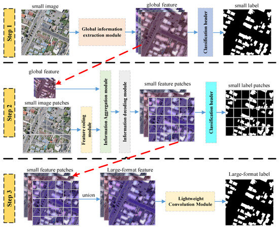 It should be noted that to better utilize the global semantic information extracted by the semantic information extraction module, high-dimensional semantic features are used as input to the subsequent feature aggregation module, instead of the semantic segmentation results. To alleviate the computational load and GPU memory usage during the training of large-format image semantic segmentation, we use the downsampling image and corresponding label to train the model in advance. During the training of the entire proposed network, the parameters of the global feature extraction module are fixed and do not participate in the backpropagation and gradient update, greatly reducing the GPU memory consumption by the network.