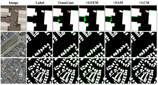 Visualization of ablation study on the WBDS dataset. white represents the building area, black represents the background, red represents missed detection, and green represents error detection.