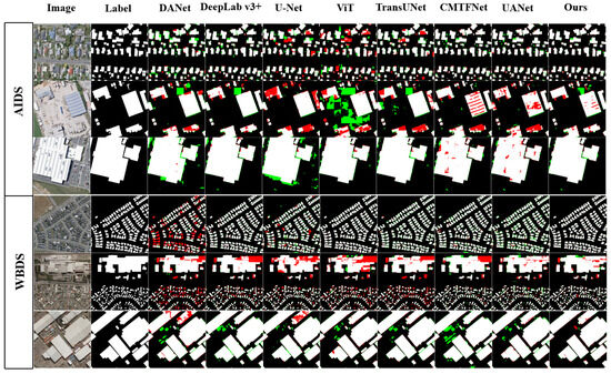 Comparisons with the state of the arts on the AIDS and WBDS datasets. white represents the building area, black represents the background, red represents missed detection, and green represents error detection.