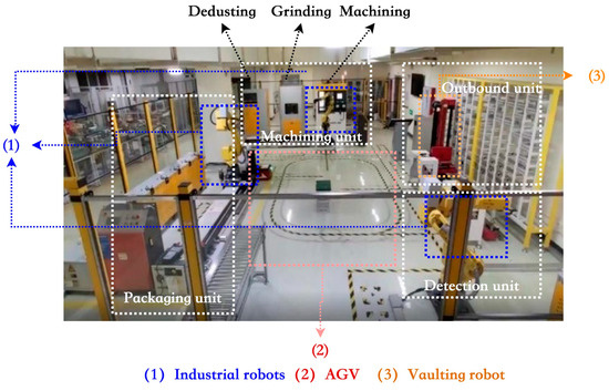 The workflow begins with the inspection of wood panels. Once verified, a robotic arm transfers the panels to the outbound unit. Subsequently, another robot systematically positions the panels for the respective processing stages. Automated guided vehicles (AGVs) transport the pallets between operational units, sequentially handling machining, grinding, and dedusting tasks. Once these processes are complete, the panels are conveyed to the packaging phase, where they are assembled into frames, boxed, and prepared for storage and distribution. Figure 2 presents a detailed information model for the processing of solid-wood panels.