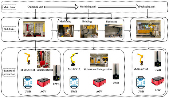 Furthermore, Figure 2 delineates the main links, the sublinks, and various factors of production. This model serves as a schematic representation that aids in understanding the application of digital twin technology within this specialized setting. After analyzing the solid-wood-panel processing line, this study notes the following production elements as necessary.