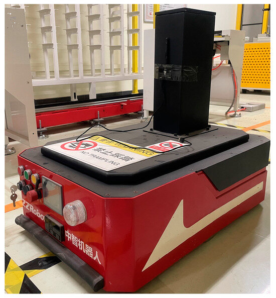 Automated guided vehicles (AGVs) play a role in transporting materials between units in the solid-wood-panel processing lines. These industrial vehicles are designed to load goods automatically, navigating through predefined routes to designated locations where they can also autonomously unload these goods. In this study, light-load lifting AGVs from Zhongzhi Robotics Company were selected, equipped with magnetic navigation, and bolstered by safety mechanisms including eight-point ultrasonic, infrared, and a safety touch edge. The image of AGV is shown in Figure 3.