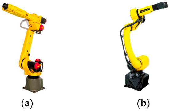 For the solid-wood-panel processing line, two models of industrial robots, M-20iA/35M and M-10iD/12, Shanghai, China, were selected as subjects for this study. An actual image of these industrial robots is depicted in Figure 4. The mentioned robots utilize servo control technology, which allows for easy installation and ensures high-speed stability during operation. Considering the need for a more extensive reach radius in the depalletizing and packaging units for grasping tasks, the M-20iA/35M model is employed in these units, offering a reach radius of 1813 mm. Conversely, the processing unit utilizes the M-10iD/12 model of industrial robot, which has a reach radius of 1441 mm.