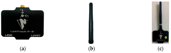 Positioning and ranging sensors are necessary to ascertain the precise locations of the automated storage and retrieval system (ASRS) robots, AGVs, and other horizontal motion processing equipment. The LinkTrackP-B model based on UWB (Ultra-Wideband) technology from the Nooploop company, Shenzhen, China was selected for this experiment. This UWB positioning and ranging sensor enhances its locational accuracy through the installation of an NAUWB01 external antenna into the screw hole. An actual image of the LinkTrackP-B model sensor is illustrated in Figure 5.