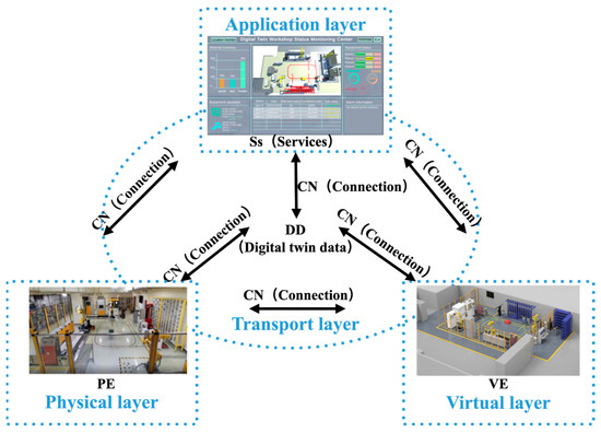 Building upon the five-dimensional model architecture established for digital twins [15], as outlined in Equation (1) [6], the digital twin framework is segmented into five integral components: the physical entity (PE), virtual entity (VE), services (Ss), digital data (DD), and the connections (CN) between these components. This structure underscores the comprehensive nature of the digital twin monitoring system, encompassing the physical, transport, virtual, and application layers.