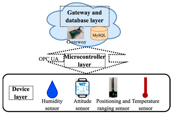 The sensor layer collects real-time data via various devices, such as angle sensors, LINKTRACK ultra-wideband (UWB) positioning systems, and environmental monitors that record metrics like temperature and humidity. Accurate data collection from these sensors is crucial, feeding into the advanced processing layers.