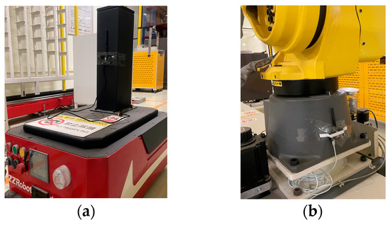 In solid-wood-panel processing production, the production elements that require the placement of UWB positioning tags include AGVs, stacker robots, and the bases of industrial robots. Their specific deployment is illustrated in Figure 10. Figure 10a illustrates the installation of UWB tags on AGVs, and Figure 10b shows the placement of UWB tags on the bases of industrial robots [22]. A calibration algorithm based on established methods was implemented to mitigate sensor bias in the UWB positioning and ranging sensors [23], which proactively calibrates the sensors by correcting for known biases before initiating the data collection cycle.