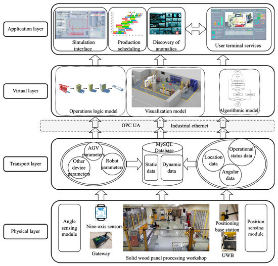 Operational data collected from sensors, along with equipment metrics, form the fundamental data set that informs the development and refinement of the virtual layer. The interplay between the physical and virtual layers facilitates the smooth carrying out of production tasks. It enables the digital twin system to accurately replicate and align with the processes within the solid-wood-panel manufacturing workflow, contributing to increased efficiency and optimization.