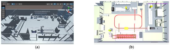 The production site’s physical layer is the cornerstone of the digital twin system, rendering a faithful representation of the actual manufacturing process for solid-wood-panel processing. This layer includes solid-wood panels; production; and transportation equipment such as industrial robots, storage equipment, sensors, automated guided vehicles (AGVs), and the encompassing production environment. Industrial robots are integral to the operational dynamics, adeptly handling tasks like inspection, assembly, and material transfer through meticulously strategized route mapping.
