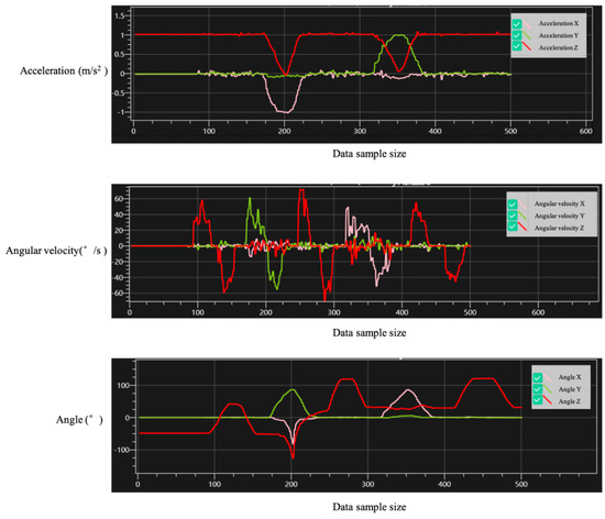 This study leveraged WT901C-485 nine-axis angle sensors to precisely determine the orientation of industrial robots, capturing essential variables for position definition. These sensors monitor rotational operations, feeding the data into a system where it was refined into angular metrics showcased on a virtual interface, facilitating accurate robot pose acquisition. Figure 11a shows the sensor mounted on the base, tracking its rotational angle in real time. Figure 11b displays a nine-axis sensor on the industrial robot’s arm. For the nine-axis attitude sensors, an error compensation protocol was employed to enhance measurement precision [24]. This included adjusting sensor readings by considering environmental influences and inherent sensor distortions. Systematic errors identified during this correlation process were rectified within the sensor’s firmware, ensuring that the angular data relayed from the robot’s critical joints were accurate and reliable.