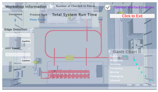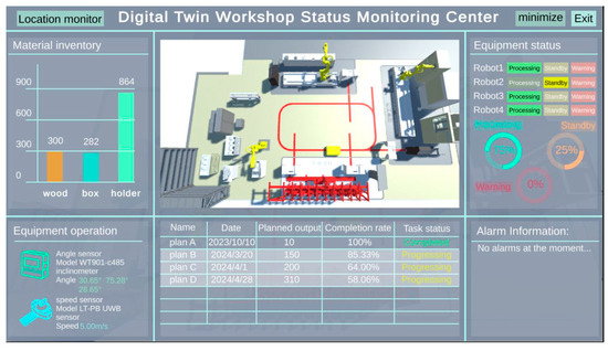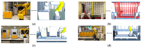 The solid-wood-panel processing production has a real-time status monitoring page for the entire production workshop. Based on the solid-wood-panel processing production status monitoring data sensing system, this interface can reflect the manufacturing state. The mapping effects of the individual processing units are depicted in Figure 20. The virtual-actual mapping of the inspection unit is demonstrated in Figure 20a, while the outbound unit’s virtual-actual mapping is shown in Figure 20b. The mapping for the processing unit is presented in Figure 20c, and the packaging unit’s mapping is displayed in Figure 20d.