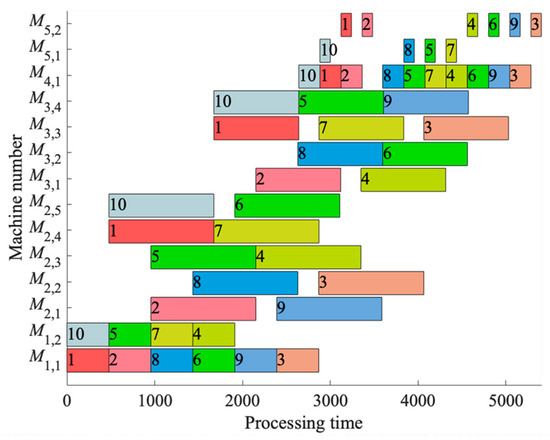 Figure 21 displays the production scheduling Gantt chart, outlining the timeframe for each wood panel to occupy a specific machine. Each wood panel was assigned a unique identification number, and corresponding colors were used consistently throughout the chart to enhance visual differentiation. This Gantt chart facilitates the clear visualization of scheduling, conveying the algorithm’s role in refining the scheduling process and ensuring timely interactions between wood panels and production units.