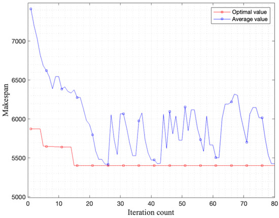 Figure 22 presents the convergence trends for DSAGA, with the red curve representing the optimal value and the blue curve depicting the average value. The chart illustrates that the maximum completion time for the best solution stabilizes after fifteen iterations, as indicated by the makespan on the vertical axis, leveling out at 5403 s.