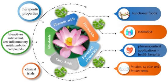 Within this study, the rich content in such bioactives observed in both aquatic plants, Nelumbo nucifera and Lemna minor, is thoroughly outlined, while their potential applications in several applications of functional products with anti-inflammatory and antioxidant health-promoting properties are thoroughly reviewed.