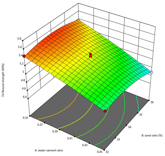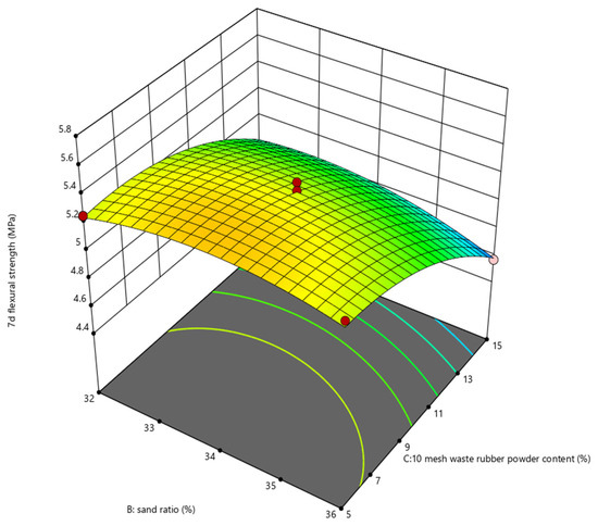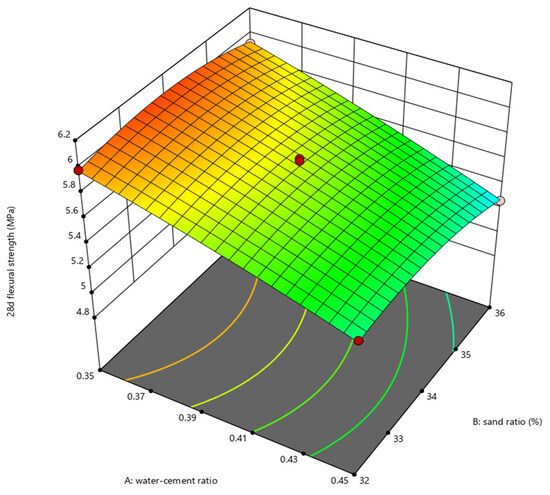 - Among the three influencing factors—the water–cement ratio, sand ratio, and waste rubber powder content—the optimization design results indicate that when the water-cement ratio was held constant and the sand ratio was maintained between 33% and 36%, the waste rubber powder content should not exceed 10%. Additionally, it was observed that the water–cement ratio exerted the most significant influence on the flexural strength of cement concrete, whereas the sand ratio had the least impact.