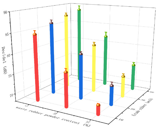 - Among the waste rubber powders, the 10-mesh variant exhibited the most pronounced noise reduction effect, whereas the 20-mesh, 30-mesh, and 60-mesh varieties showed comparable noise reduction effects in concrete. Moreover, an increase in waste rubber powder content correlated with improved noise reduction capability.