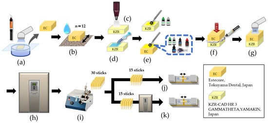 Schematic illustration of the experimental setup for microtensile bond strength (µTBS) testing: (a) resin-based composite for core build-up (Estecore) was packed into the silicone mold; (b) grinding of the adhered surface with #600 SiC paper; (c) alumina airborne particle abrasion with 50 µm particles; (d) pre-treatment using Multi-Etchant; (e) application of primer/adhesive; (f) luting of resin-based composite CAD/CAM block; (g) light-curing for 80 s and waiting for 30 min; (h) storage of specimens in water at 37 °C for 1 week; (i) cutting into 1 mm2 stick-shaped microspecimens; (j) µTBS testing immediately after cutting; (k) µTBS testing after further storage in water at 37 °C for 6 months.