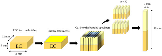 After storage in water at 37 °C for 1 week, specimens were serially sectioned perpendicularly to the adhered surface using a low-speed water-cooled diamond saw (Isomet) to obtain rectangular 1 mm × 1 mm stick-shaped microspecimens (Figure 2). Thirty of the obtained microspecimens were selected from the center of each specimen and visually examined. The microspecimens with obvious defects, such as voids and gaps within the built-up composite, were eliminated before bond testing. Half of the microspecimens were attached to a microtensile jig using cyanoacrylate glue (Model Repair II Blue, Morita Dental Products, Ohtawara, Japan) and subjected to a tensile load using a microtensile tester (Bisco, Schaumburg, IL, USA) at 1.0 mm/min crosshead speed until failure (immediate group). The other half of the sticks in each group were further immersed in water at 37 °C for 6 months and tested for µTBS (aged group). The width and thickness of each specimen were measured to the nearest 0.01 mm using a digital caliper (CD-15 CPX, Mitutoyo, Kawasaki, Japan) to determine the microtensile bond strength (μTBS, MPa) by dividing the recorded force (N) at the time of fracture by the bond area (mm2). If a specimen failed before proper testing, a bond strength of 0 MPa was used for statistical analyses [31,32,33]. The actual number of pre-testing failures was also explicitly noted.