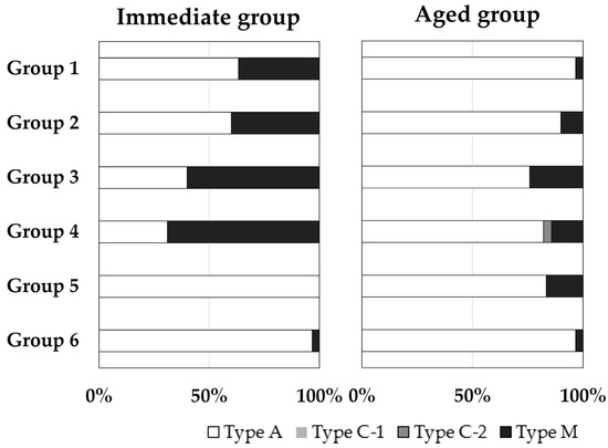 Fracture mode distribution in percentage (%) for immediate and aged groups: Type A: complete adhesive failure between the post-and-core RBC and CAD/CAM RBC block, Type C-1: cohesive failure in the post-and-core RBC, Type C-2: cohesive failure in the CAD/CAM RBC block, Type M: mixture of adhesive and cohesive failures.