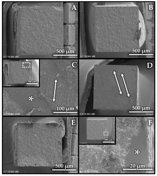 Representative scanning electron microscope images of the fractured surfaces after microtensile bond strength (µTBS) testing in the immediate groups: (A) OptiBond eXTRa Universal with silane, build-up material side. Fine undulations can be seen; (B) OptiBond eXTRa Universal with OptiBond eXTRa Universal Primer (without silane), build-up material side. Fine undulations are evident; (C) OptiBond Universal with silane, CAD/CAM-block side. Obvious scratches (double-sided arrows) and failure within the cement layer (asterisk) are observed; (D) OptiBond Universal without silane, build-up material side. Obvious scratches (double-sided arrows) can be seen; (E) OptiBond Solo Plus with silane, build-up material side. Fine undulations are evident; (F) OptiBond Solo Plus without silane, build-up material side. Fine undulations and failure within the cement layer (asterisk) can be seen.