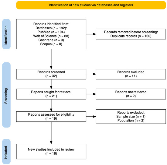 A total of 192 records were identified through a widespread electronic search of the databases PubMed and Web of Science, as shown in Figure 1 (the flow chart was created using the PRISMA Flow Diagram tool) [25]. After removing duplicates, 32 records were screened based on their titles and abstracts. Out of those 32 records, 21 were sought for retrieval. Two references could not be retrieved; hence, full-text screening was performed of 19 articles based on the inclusion criteria and 16 finally remained for this systematic review, with a total number of 921 patients being evaluated. All the present articles were RCTs.