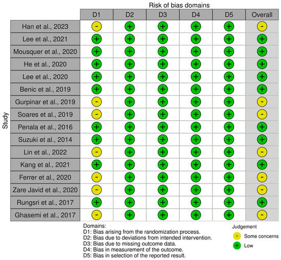 The risk of bias in the 16 randomized controlled trials was assessed using the Cochrane risk-of-bias assessment tool version 2 [19]; most studies included were classified as having a low risk of bias (n = 9). Seven studies were classified as having some concerns, mainly due to questions related to the randomization process. The results are reported in Figure 2.