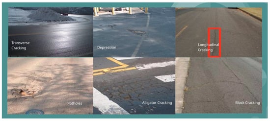 The effectiveness of pavement health assessment and crack detection heavily relies on the quality and diversity of the datasets used, as well as the rigor of the methodologies applied. This section provides a detailed overview of the data sources utilized, including their characteristics and preprocessing steps. Additionally, it outlines the machine learning models and algorithms employed for crack detection and classification, emphasizing innovations aimed at overcoming current limitations in handling complex crack topologies, noise interference, and sensitivity to thin cracks. By integrating robust data sources with state-of-the-art methodologies, this research aims to enhance the accuracy and efficiency of pavement management practices, ultimately contributing to safer and more sustainable infrastructure systems. Figure 1 shows the types of pavement distress under study.