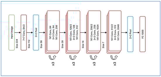 This study explores three key machine learning models pivotal in pavement distress classification, each offering unique advantages crucial to the success of our classification efforts. The first structure is the ResNet50 architecture (Figure 3).