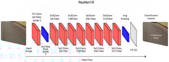 While ResNet18 may not capture as detailed features as deeper models, its optimized design strikes a balance between complexity and computational efficiency [38,39]. This balance renders ResNet18 particularly valuable in scenarios requiring lightweight models or strict computational constraints. It proves effective for real-time processing and deployment on resource-constrained devices, offering a reliable solution for precise and efficient pavement distress classification.