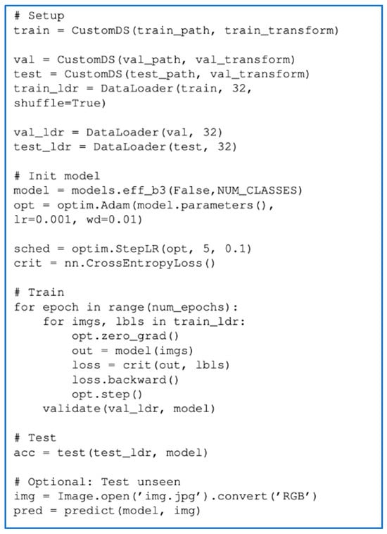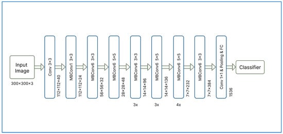 The EfficientNetB3 architecture (Figure 5) is meticulously designed with multiple blocks that specifically enhance feature extraction efficiency. These blocks incorporate depth-wise convolutions and squeeze-and-excitation modules to boost operational effectiveness. Depth-wise convolutions, which apply a separate filter to each input channel, reduce computational demands significantly by limiting the number of parameters while maintaining robust performance.
