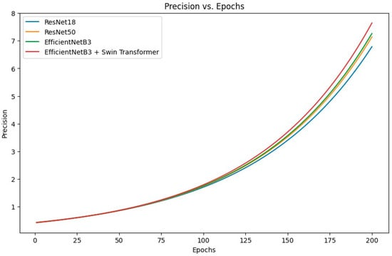 For the two models, the difference in their mean F1-scores is within 5% to 15% with confidence, which statistically upholds the significance of the performance increase when using EfficientNetB3 + SwinGAN. Figure 7 illustrates the fluctuation of precision scores over epochs across different convolutional neural network models, offering insights into their precision performance and convergence patterns.