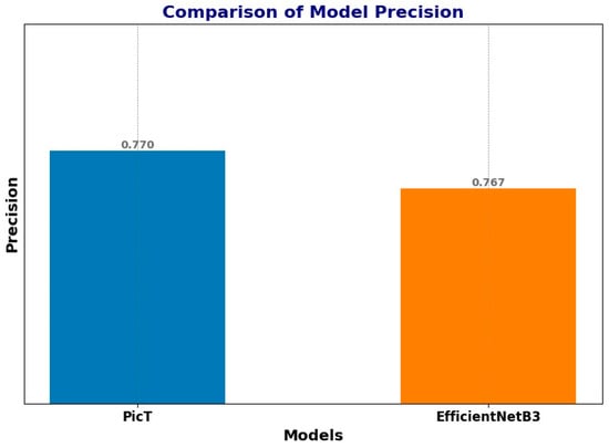 Therefore, the choice between EfficientNetB3 and PicT hinges on several factors, including required precision, available computational resources, and environmental constraints during model deployment. This decision is crucial for ensuring that the selected model effectively represents and addresses the specific application needs at hand. Figure 8 shows the different precision levels achieved by each model during our implementation.