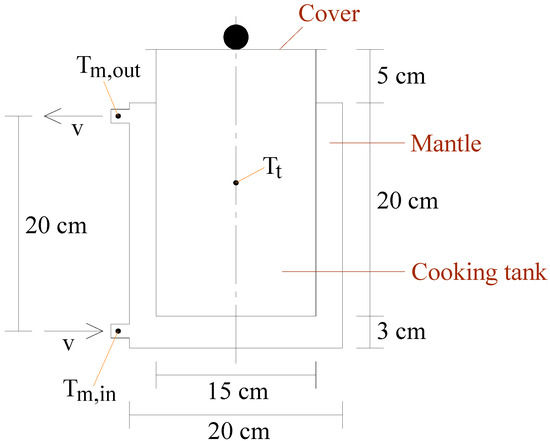 - Convective heat transfer between the inside of the mantle and the outer surface of the cooking tank’s wall. Taking into account the liquid in the mantle (water) and the material of the cooking tank wall (stainless steel), and assuming forced convective heat transfer along the surface of the wall, the heat transfer coefficient is , which is an average value according to [34].