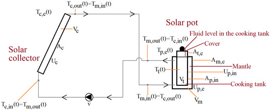 The experimental solar heating system with the solar pot and the time-dependent variables along with the parameters of the system are shown in Figure 3.